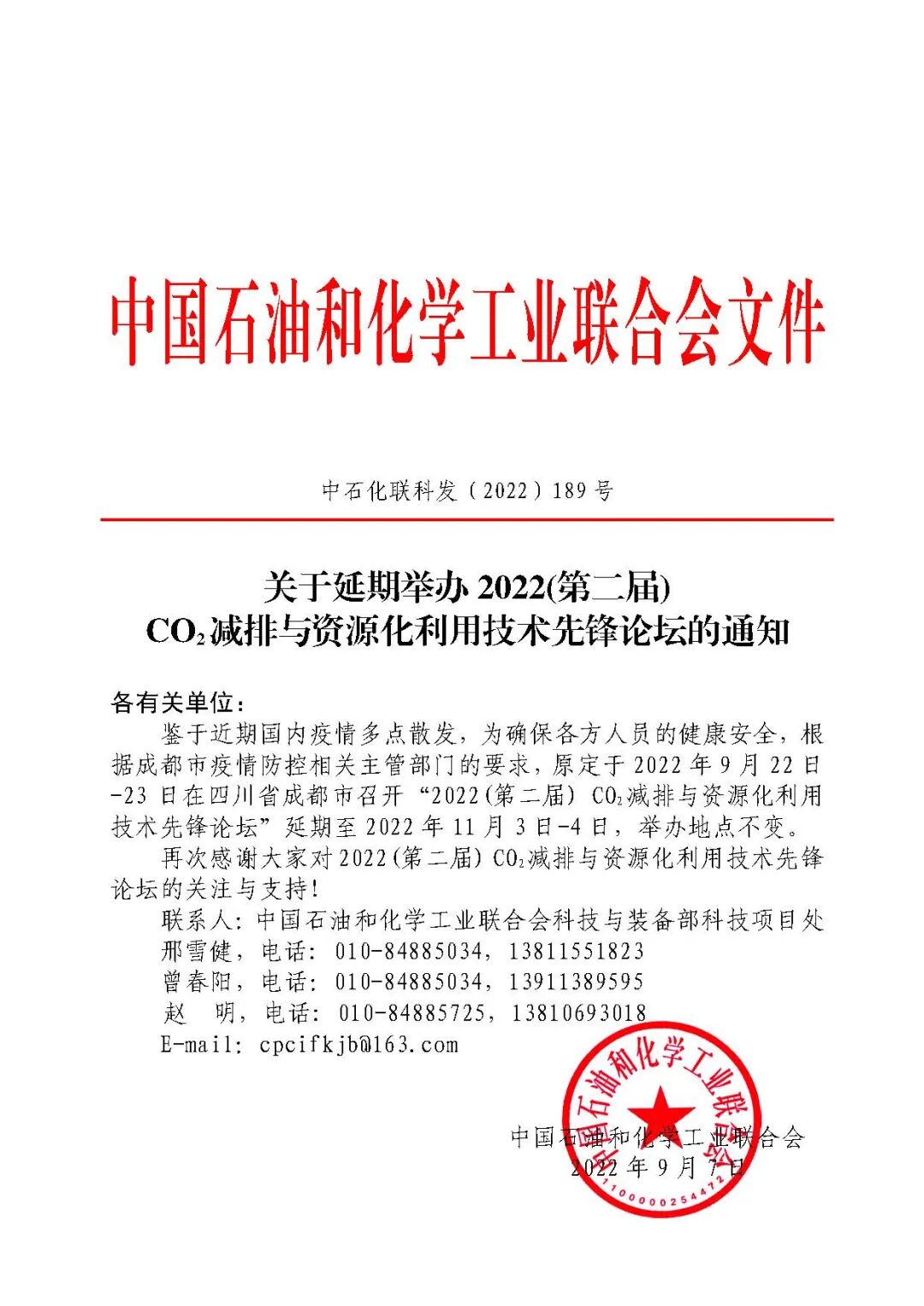 鉴于近期国内疫情多点散发,为确保各方人员的健康安全,根据成都市疫情防控相关主管部门的要求,原定于2022年9月22日-23日在四川省成都市召开“2022(第二届) CO2减排与资源化利用技术先锋论坛”延期至2022年11月3日-4日,举办地点不变。