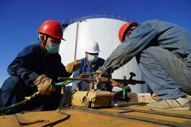 在年产30万吨煤焦油深加工项目建设现场,工作人员正在通过等离子切割技术对钢板进行切割。(融媒体中心记者郭子毅摄)