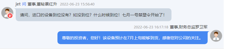 公司董事,财务总监罗卫军在回答投资者提问时表示,PBAT进口设备预计在7月上旬能够到货。