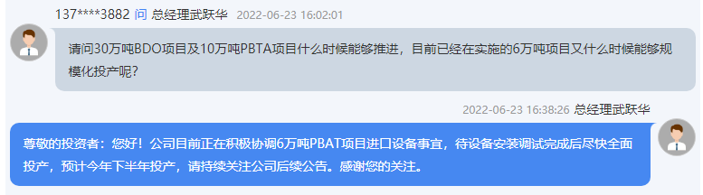 在线上交流活动中,公司总经理武跃华在回答投资者提问时表示,公司目前正在积极协调6万吨PBAT项目进口设备事宜,待设备安装调试完成后尽快全面投产,预计今年下半年投产。