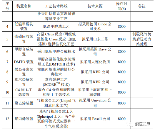 本项目气化拟采用华东理工大学的 6.5MPa 多喷嘴对置式水煤浆加压气化技术,净化采用德国 Linde 公司的低温甲醇洗技术,甲醇合成采用英国 Davy 公司的低压甲醇合成技术,甲醇弛放气采用膜分离和变压吸附工艺回收氢气,硫回收采用山东三维公司的硫回收技术,甲醇制烯烃采用中科院大连化学物理所最新的 DMTO-Ⅲ代技术,烯烃分离及轻烃利用采用美国 KBR 公司的前脱丙烷工艺技术及 SCORETM蒸汽裂解技术,聚乙烯采用 Univation 公司的 Unipol 气相流化床工艺技术,聚丙烯采用 Basell 公司的 Spheripol 液气相相结合工艺技术 等先进煤化工、石油化工工艺技术装备。