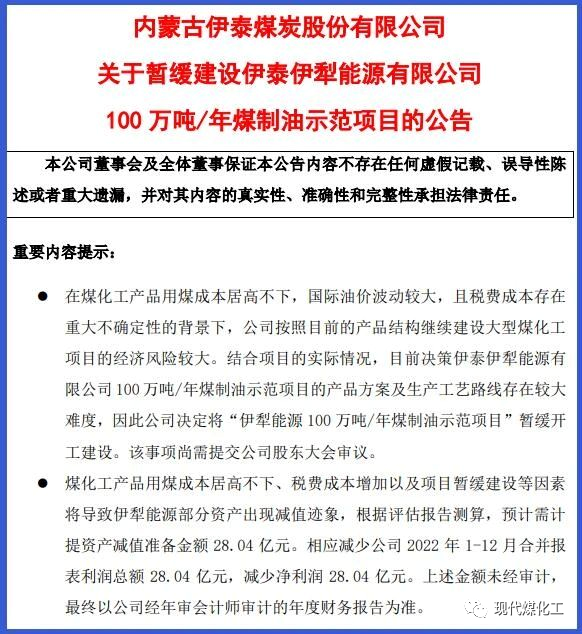 内蒙古伊泰煤炭股份有限公司2月8日公告,暂缓建设伊泰伊犁能源有限公司100万吨/年煤制油示范项目。公告表示,在煤化工产品用煤成本居高不下,国际油价波动较大,且税费成本存在重大不确定性的背景下,按照目前的产品结构继续建设大型煤化工项目的经济风险较大。结合项目的实际情况,目前决策伊泰伊犁能源有限公司100万吨/年煤制油示范项目的产品方案及生产工艺路线存在较大难度,因此公司决定将暂缓开工建设。