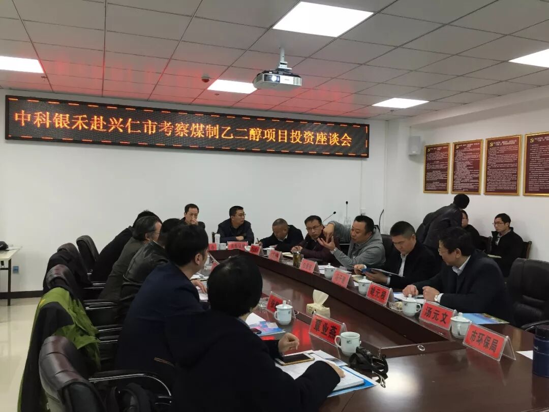 市园区办主任白美宏主持会议并围绕我市发展煤制乙二醇项目的优势、兴仁工业园的发展规划、基础设施配套、项目的资源配置等进行招商环境推介。 林远航董事长对兴仁丰富的资源禀赋、项目的生产要素、良好的生态环境、较大的开放空间、良好的营商环境、厚重的文化底蕴和多元的经济构成给予充分的认同。并表示当前的兴仁正处于加速推进经济转型、同步建成小康社会的关键期。实现经济转型、经济发展,企业愿意投资和支持参与兴仁的工业发展,助推地方经济建设。双方可在煤化工领域开展合作,以煤制乙二醇项目为突破点,逐步拓展到大健康、旅游文化、房地产等产业合作。在下一步的工作中,中科银禾将安排与兴仁紧密对接,完成两项工作,一是共同研讨出科学的投资合作方案,落实在兴仁投资煤制乙二醇项目合作。二是协助完成项目审批立项等工作。