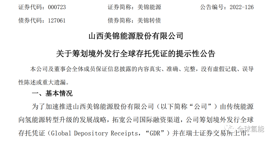 该公告表示,为了加速推进山西美锦能源股份有限公司(以下简称“公司”)由传统能源向氢能源转型升级的发展战略,拓宽公司国际融资渠道,公司筹划境外发行全球存托凭证(Global Depository Receipts,“GDR”)并在瑞士证券交易所上市。