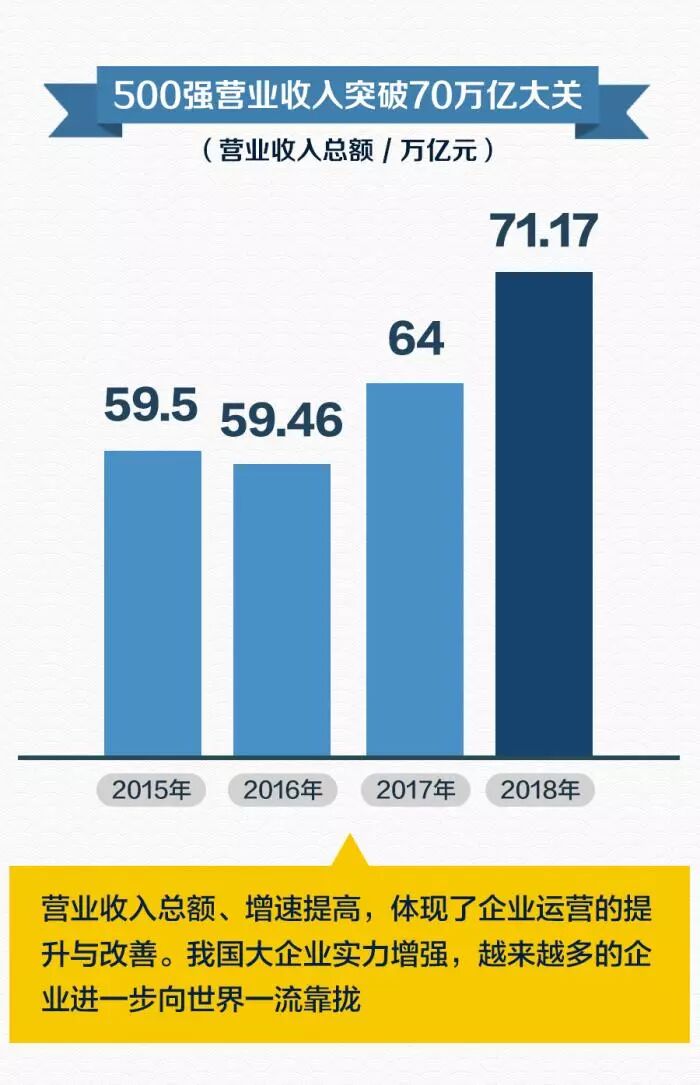 继上年迈过60万亿的门槛后,“2018中国企业500强”的营业收入总额首次突破70万亿元大关,达到71.17万亿元,相当于去年我国经济总量的86%,比日本、德国、英国的经济总量相加还要多。