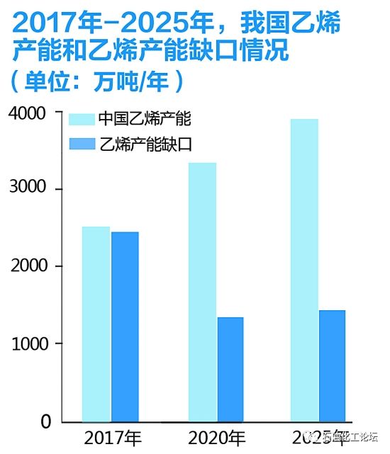 ——我国炼油能力过剩,但是乙烯产能明显不足,油大化小,一体化率低。当前,我国炼能在世界已稳居第二,中石化、中石油炼能分别位居世界第一大、第三大。2020年炼能或将过剩1.4亿吨。国内乙烯产能虽不断增长,但远赶不上乙烯消费增量,2025年仍将有1427万吨的缺口。炼能过剩、乙烯缺口,相当于双重效益流失。