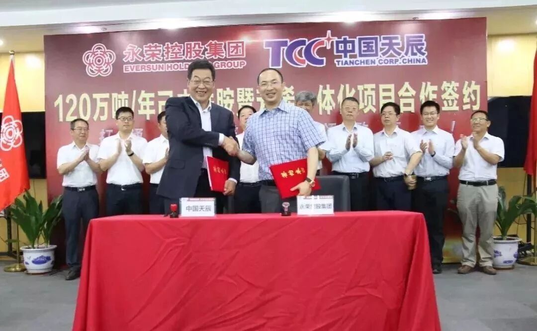 5 月 21 日上午,永荣控股集团与中国天辰公司签署全面战略合作协议。中国天辰公司党委书记、董事长、总经理袁学民,高级顾问许纯,永荣控股集团执行董事长吴华新,常务副总裁陈飞等人出席仪式并见证签约。