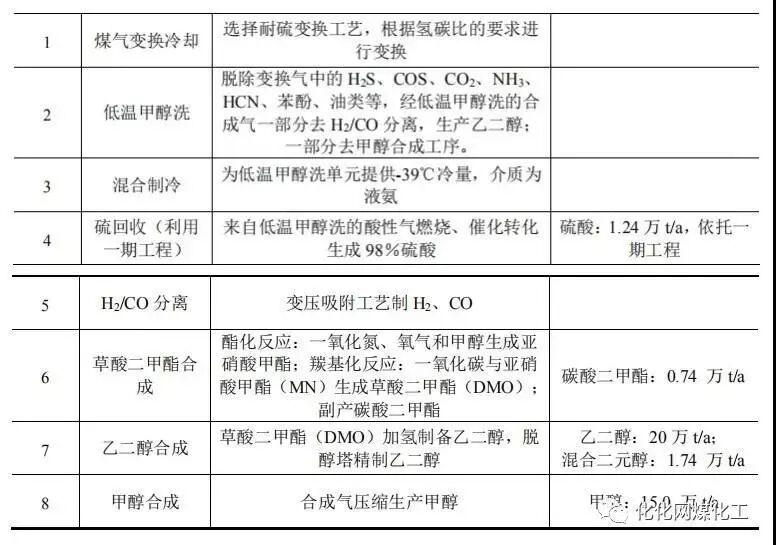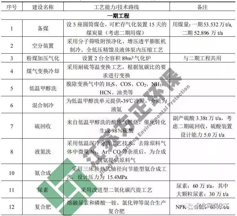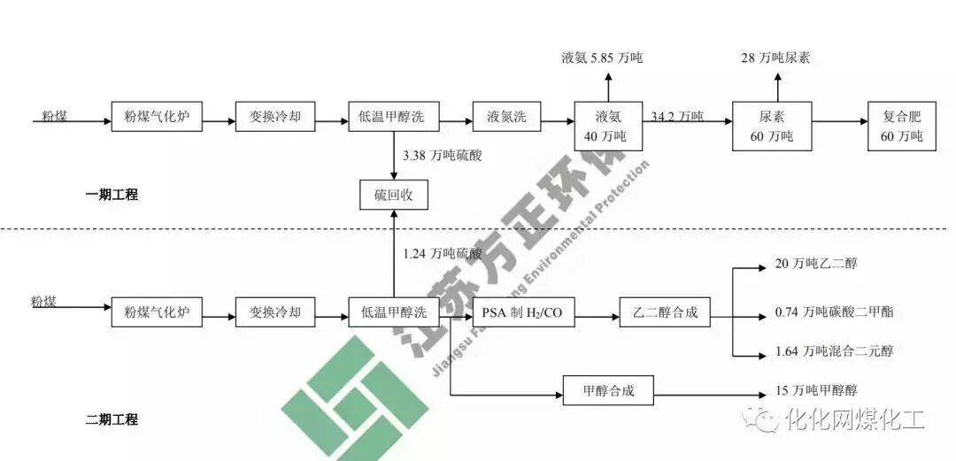 一期采用煤粉气流床加压连续气化工艺,形成年产40万吨合成氨、60万吨尿素(含60万吨尿基复合肥),3.38万吨98%浓硫酸生产能力(设计能力5万吨/年,二期1.2万吨/年);二期采用煤粉气流床加压连续气化工艺,形成年产20万吨乙二醇,副产15万吨甲醇,0.67万吨碳酸二甲酯,1.76万吨混合多元醇。