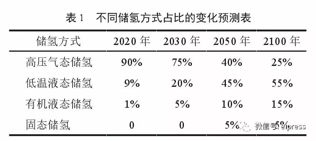 目前工业氢气主要采用高压气态的方式储存,由于成本的限制,液态储存的方式使用较少,主要用于航空航天领域。但随着技术的不断成熟,预计2050年液态储氢将成为工业氢气的主要储存形式,不同储氢方式占比的变化预测结果如表1所示。