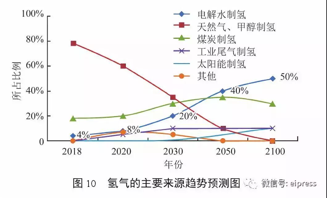 在所有的人工制氢途径中,电解水制氢可以有效地消纳风电、光伏发电等不稳定电力,以及其他富余波谷电力,因而将贯穿于氢能发展的全过程,是建设“氢能社会”工业氢气的主要来源之一(图10)。随着电解水制氢技术的不断发展和成本的逐渐降低,电解水制氢将能逐渐满足商业化的要求,实现分布式制氢。未来,既可以集中制氢、区域供氢,也可以单个加油站建设小型电解水制氢装置,实现氢能源智慧互联。