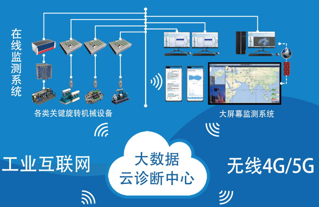 在线式设备监测和故障诊断系统利用数采器将采集到的信号上传至本地服务器或大数据云诊断中心,通过后台对数据进行分析,可实现早期预警、精准诊断、远程诊断,增加设备可靠性与稳定性。
