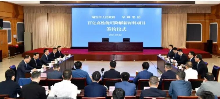 2021年4月22日下午,瑞安市人民政府与华峰集团正式签约百亿级高性能可降解新材料项目。该项目是瑞安首个本土裂变百亿级单体制造业项目,将助力地方经济发展,推动实现碳达峰碳中和。