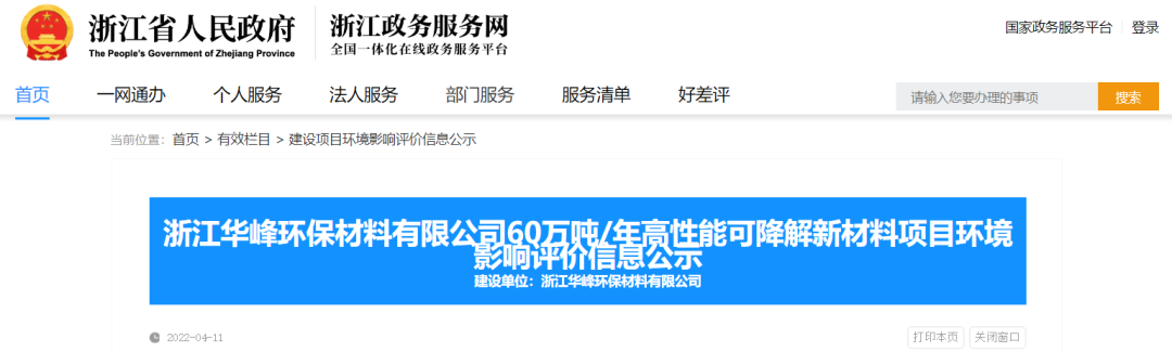 2022年4月11日,浙江政务服务网发布《浙江华峰环保材料有限公司60万吨/年高性能可降解新材料项目环境影响评价信息公示》。