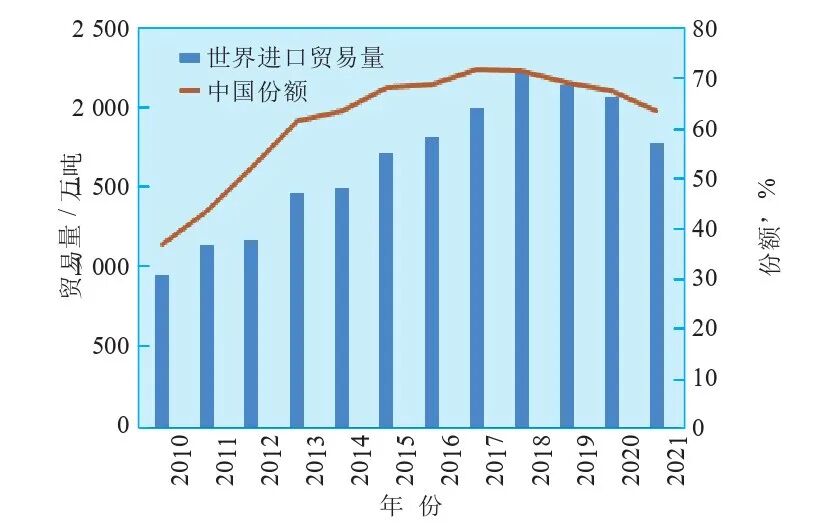 因区域内生产和需求的不匹配,全球PX的年贸易量在2000万吨左右。其中进口贸易主要集中在北美的美国及墨西哥、西欧和亚洲的中国及中国台湾省、印尼等地。尤其是中国,由于下游PTA产能的快速扩张及一段时期内民众的误解造成国内PX产能建设严重受阻,在全球的贸易份额中不断攀升。2019年后,随着中国新一轮投产高峰的开启,全球PX贸易量出现明显的萎缩,但由于中国缺口量太大,短期内仍是全球的贸易中心,需要从其他亚洲国家(地区)、中东国家以及印度进口,但中国占全球贸易额的比例已经出现下降趋势(见图3)。