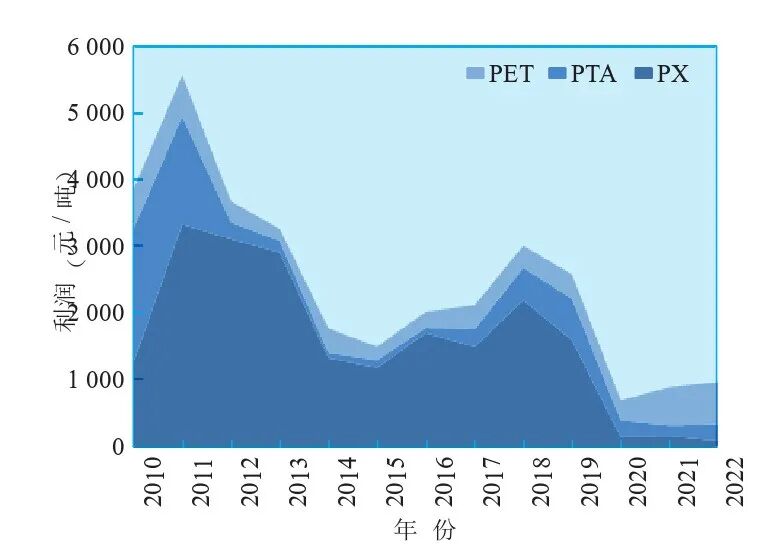 多年来,中国PX产业链发展都是上游慢、下游快,即下游PTA和聚酯产能增长大于PX产能增长,形成了明显的供需“剪刀差”,这也造成了国内PX进口量居高不下,屡创新高。近几年大炼化项目都配套大PX装置,PX新增产能规模远大于下游PTA及PET,PX行业将由扩张期向成熟期发展,竞争格局加剧,利润大幅压缩(见图7)。上下游产能投放的节奏不一致,必然带来行业利润在各环节的阶段性调整,PX产业链利润将逐渐向下游PTA及PET倾斜(见图8)。