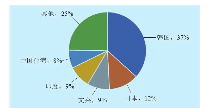 2020年我国PX进口量为1386万吨,同比下跌7.2%。从进口来源地来看,亚洲的韩国、日本、印度、中国台湾及泰国等地仍是我国主要的进口来源,文莱跃居前三(见图4)。