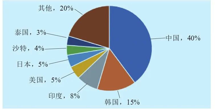 从各个国家的产能布局来看,2021年全球PX产能在200万吨以上的国家或地区有中国、韩国、印度、美国、日本、沙特、泰国等,以上7个国家或地区的产能合计占全球的80%,其中中国约占40%(见图2)。