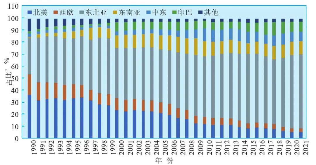 全球PX工业发展已经30多年,早期以欧美装置为主导,随后东北亚地区发展远超世界其他地区水平,先是日韩产能崛起,近年来随着中国PTA–PET产业的积极向上游拓展,中国国内产能增长迅猛,东北亚地区在世界的地位不断上升,到2021年,东北亚地区产能已占全球的62.1%,较1990年的30.9%已提高1倍(见图1)。