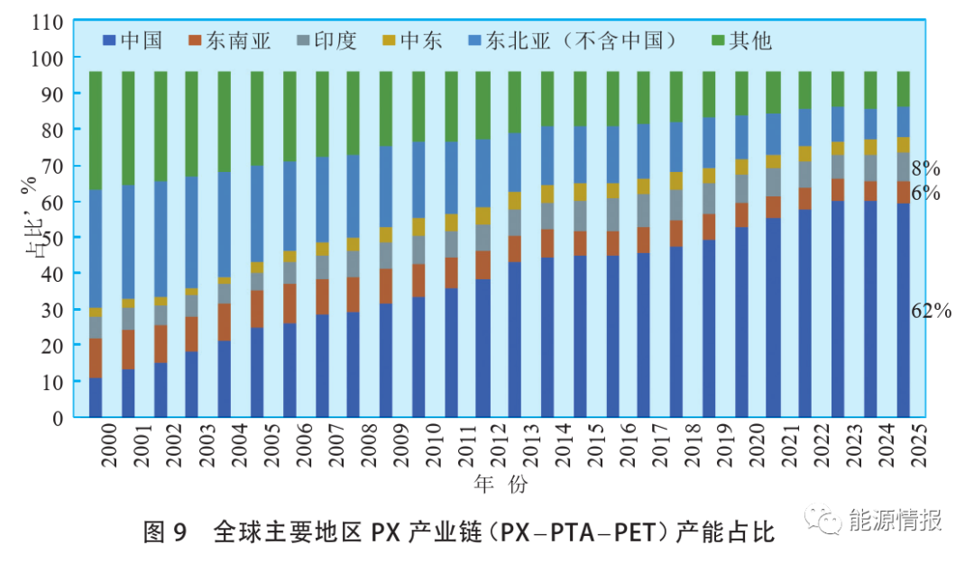 从全球来看,到2025年除了文莱、沙特、印度等地仍有投资计划外,其余各地PX工业基本停滞发展,届时中国产能占世界的比重将进一步提高到47%。