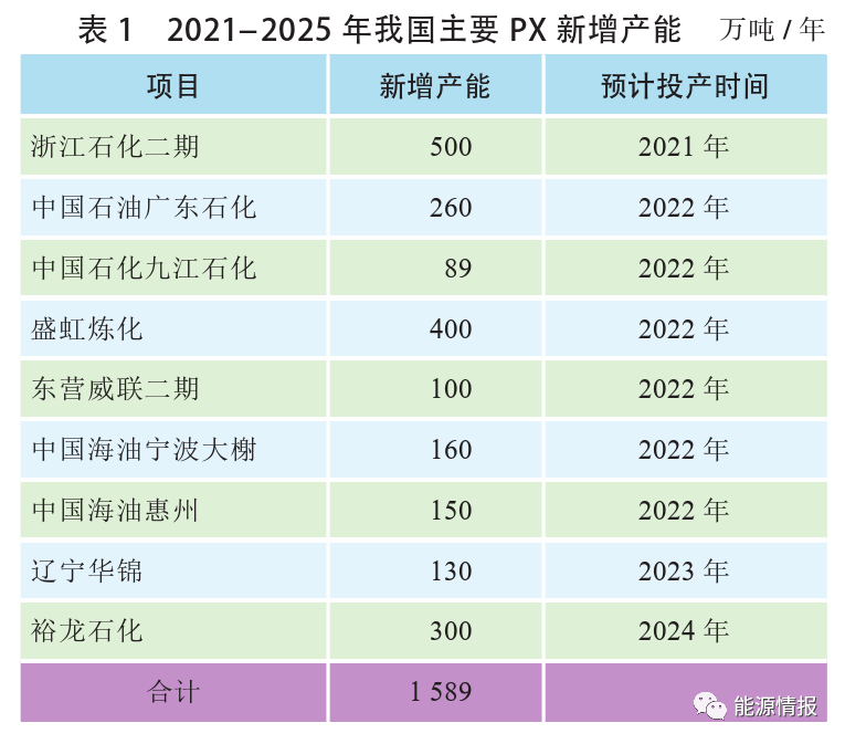 未来,在国家的统筹规划下,我国炼油工业仍将保持一定增长,而随着柴油需求已达峰值,汽油消费增速放缓,未来大型炼厂在装置规划中,必将适应“油转化”的趋势,多产烯烃和芳烃,提高化工用油的比例。因此未来我国芳烃产业仍将保持稳步增长。预计2025年前,仍有大量炼油配套的PX装置投产,如盛虹炼化、中国石油广东石化、中国石化九江石化等(见表1),若规划的项目如期投产,预计到2025年我国PX产能将突破4500万吨/年。随着国内产能的快速增长,我国PX供需格局将面临巨大转变,有望迎来自给自足的新局面。