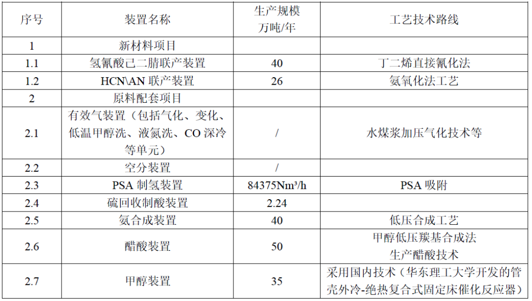 根据环评文件,公司将投资137.9亿,新建40 万吨/年己二腈、26 万吨/年丙烯腈、28 亿标方/年合成气、35 万吨/年甲醇、50 万吨/年醋酸、6.75 亿Nm³/年氢气、13 万Nm³/小时氧气空分装置及其他配套公用和环保工程。项目占地面积1142000 ㎡,公司依托天辰公司自主知识产权的“丁二烯直接氰化法”合成己二腈技术,依托园区丁二烯抽提装置提供的丁二烯,新建40 万吨/年的己二腈装置以及26 万吨/年丙烯腈,以满足国内市场对己二腈的大量需求。