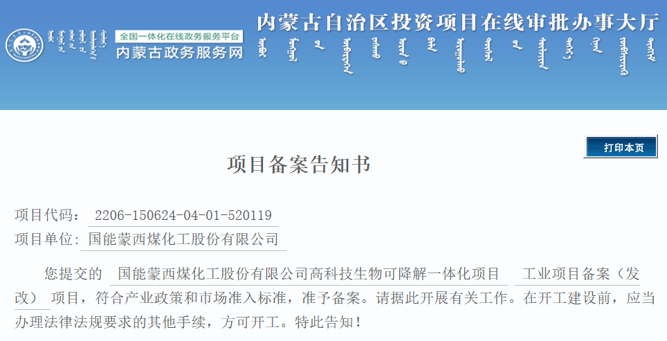 2022年6月11日,内蒙古政务服务网发布国能蒙西煤化工股份有限公司高科技生物可降解一体化项目的备案告知书。