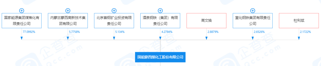 据企查查显示,国能蒙西煤化工股份有限公司大股东为国家能源集团煤焦化有限责任公司,持股77%。后者为国家能源投资集团有限责任公司100%控股子公司。