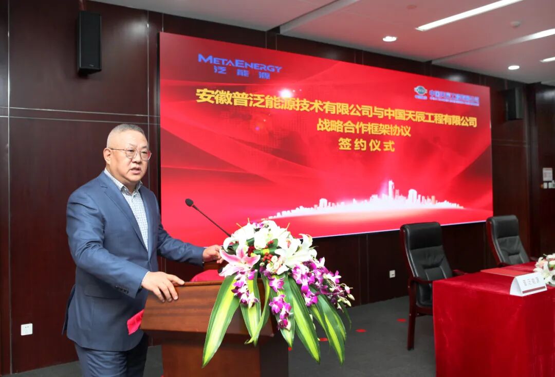 栾立刚先生代表普泛能源做了发言,栾立刚表示,天津是中国化学工业的发源地,双方皆与天津有缘:中国天辰工程有限公司前身为化工部第一设计院,始建于1953年,是化工系统最早的国家级设计单位,1973年总部迁址于天津市。安徽普泛能源技术有限公司于2021年来到天津,与天津渤化永利化工股份有限公司进行项目合作,又与中国天辰工程有限公司开展战略合作,普泛能源的首席科学家谷俊杰院士1987年毕业于天津大学化学工程系,获硕士学位,28岁即成为天津大学最年轻的副教授,也是天津有缘人。今天双方又相聚天津,真可谓“有缘天津来相聚”。栾立刚认为中国天辰是中国化工工程技术的排头兵,普泛能源是能源高效利用技术的新兵,在未来的合作中,普泛能源定将竭尽全力,发挥技术创新能力,开发一个又一个创新技术,通过双方的共同努力,推广应用到市场中去,为中国的绿色低碳化工事业做出贡献。