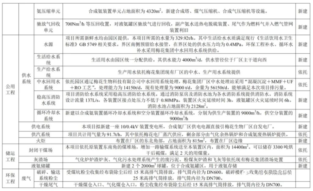 据通辽政府网2022年10月消息,通辽梅花生物科技有限公司原料氨装置技术升级改造项目总投资143622.05万元,已完成投资9.6亿元。预计明年4月投产。据股闻快讯11月消息,梅花生物董秘在回答投资者提问时表示,通辽原料氨等项目重大项目预计于明年二季度投产试车。通辽建龙制酸采用流化床气化,变换,低温甲醇洗,液氮洗,15MPa氨合成,生产24万吨/年合成氨,淘汰两套恩德炉气化合成氨装置。建设地点:位于内蒙古通辽市木里图镇通辽市科尔沁工业园区(南区)。南侧为现有16万吨/年合成氨装置区,北面为远期预留发展用地,东面紧邻园区南北向货运主通道及铁路专用线,西面是空地。项目占地为15.35hm2。总投资及环保投资:项目总投资143622.05万元,其中环保投资5060万元,约占总投资的3.52%工作制度:项目设计年操作时间为8000h(333天),主要生产装置采用五班编制三班运行、维修人员及车间管理人员采用白班兼值班制、行政管理人员及后勤人员为白班制。建设规模:总计生产规模为24万吨/年合成氨,液氮11000吨/、液氧5700吨/年、液氩9200吨/年、硫磺2290吨/年。整个项目分为:生产装置区、公用工程区、液氨罐区、火炬区等四大功能区。