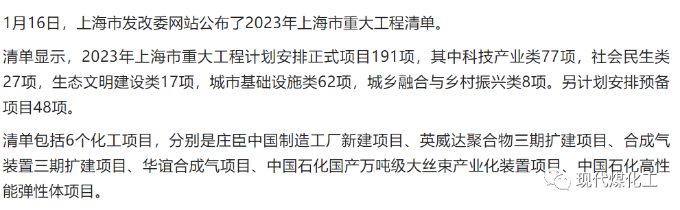 6个化工项目入选2023年上海市重大工程清单
