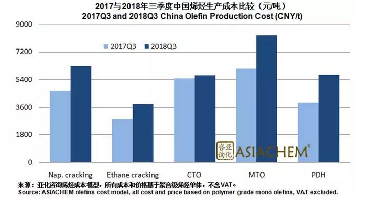 在当前价格体系下,2018年三季度5个项目吨烯烃成本由低到高依次为:乙烷裂解、CTO、PDH、石脑油裂解、MTO。在中国工业化的烯烃生产工艺路线中,CTO项目下游多配套聚烯烃装置,得益于较低的成本及坚挺的产品价格,项目利润可观。亚化咨询认为,
