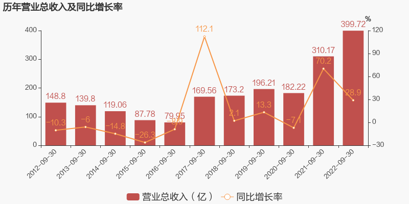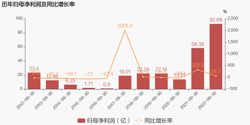 潞安环能于2022年10月28日披露三季报,公司2022年前三季度实现营业总收入399.72亿元,同比增长28.9%;实现归母净利润92.68亿元,同比增长58.7%;每股收益为3.1元。