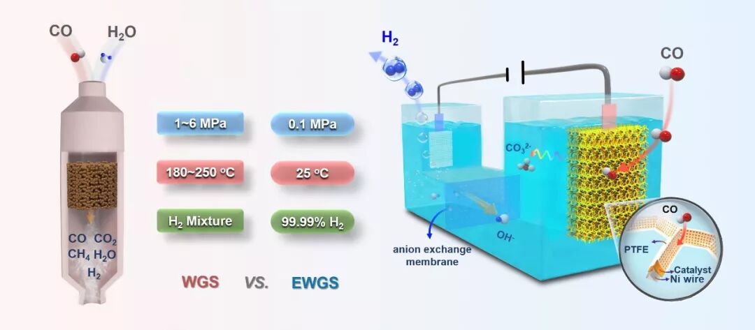 邓德会团队经过长期探索,结合电化学反应原理,巧妙地将WGS的氧化还原反应拆分为彼此分离的两个半反应,首次提出了一种能在常温常压下直接制备高纯氢气的电化学水汽变换概念。