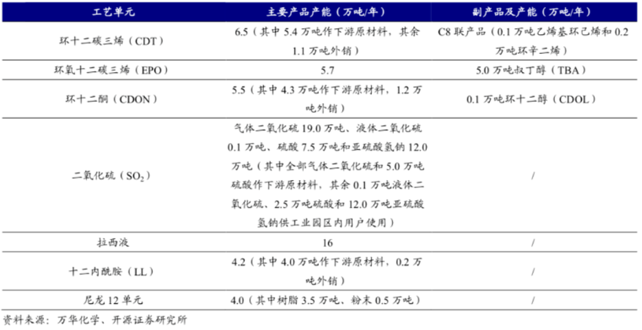 万华化学在尼龙12领域经历了厚积薄发的过程。自2012年公司即开始尼龙12 材料相关专利的申请。尼龙12 的生产中有两个难点,首先是肟化反应工艺流程复杂,反应效率低等问题,另外贝克曼重排是最重要的生产环节,对产品质量的影响起到了关键作用。针对这两个生产难点,万华不断积极尝试以寻求突破,并取得了一些相关的生产专利。2013 年万华尼龙12小试项目正式启动,由于尼龙项目全产业链流程复杂,万华成立多个并列研发小组,各反应单元同时开展研究,以提升研究的效率。同时项目组研发工作还联合高校建立产学研项目,对外考察交流超百次,最终选择了一条收率较高且三废更少,工艺更温和的工艺路线,为尼龙12技术的突破奠定了坚实的基础。2019年年底,公司的“尼龙12全产业链制造成套技术开发及产业化”项目被选为山东省重大科技创新工程项目并获得省级补助经费。同期4万吨/年尼龙12项目得到环评批复,进入工业化实施阶段。2020年4月15日全面开工建设;2022年6月14日EPO工序产出合格产品;9月8日CDT工序产出合格产品;9月29日 CDON工序产出合格产品;10月9日LL工序产出合格产品;10月10日AS工序产出合格产品;10月18日产业链最后一道工序尼龙12也顺利产出合格产品。目前万华尼龙12项目已进入工业化实施阶段,有望率先实现国产化,打破海外厂商垄断。万华化学4万吨/年尼龙12项目位于山东烟台工业园,公司延续了一直以来的一体化发展思路,该项目主要原料丁二烯为其百万吨乙烯项目标副产物,不但进步了整个产业链的附加值,还有望有效下降尼龙12的生产成本,其项目规划详情见表1。尼龙12即PA12,又叫聚十二内酰胺、聚月桂内酰胺,是一种半结晶-结晶热塑性材料,也是一种长碳链尼龙,属于特种尼龙范畴。尼龙12通常采用丁二烯为原料,由环十二碳三烯(CDT)和月桂内酰胺开环缩聚制得,工艺包括氧化肟化法、光亚硝化法和斯尼亚法,其中氧化肟化法是主流工艺。氧化肟化法生产尼龙12需经三聚、催化加氢、氧化、酮化、肟化、贝克曼重排、开环聚合等7个步调,且整个进程中要使用苯、发烟硫酸等有毒、腐蚀性较大的原料,开环聚合温度需270~300℃,生产步调操纵难度较大。因生产难度大,被国外垄断长达近半个世纪,包括全球瑞士 EMS(产品名:Grilamid)、法国阿科玛(Arkema)(产品名:Rilsamid®)、日本宇部兴产(UBE)(产品名:UBESTA XPA)和赢创工业集团(Evonik)等四家企业,牢牢掌握尼龙12的生产技术近半个世纪,掌握了近乎100%的市场。上世纪50年代中国就已经开始对以长碳链尼龙为代表的特种尼龙进行国产化生产的尝试,但由于工艺路线复杂、生产条件苛刻、合成步骤多、成本高等因素,直到90年代中国长碳链尼龙工业化生产依旧停滞不前。“九五”规划期间,郑州大学尼龙研究团队与中科院微生物所共同承担了国家重点科技攻关计划,研究开发了以生物发酵十二碳二元酸制备PA1212的工业生产技术,并与山东淄博广通化工公司合作,实现了工业化生产。除万华化学外,山东广垠新材料有限公司亦在PA610、PA612、PA1012等品种有所突破。尼龙12具有吸水性小、密度小、耐摩擦、低磨耗、耐燃油、耐候性能好等优点,综合性能十分优异,主要应用于汽车制造、3D打印、油气开采、电子电气以及医疗技术等领域。尤其可广泛应用于汽车流体输送管线,包括燃油管线、离合器管线、真空刹车增压器管路、空气刹车管路、电池冷却液管线以及上述管线的接头,因其安全可靠,是优良的汽车轻量化材料。据QY Research预计,全球尼龙12的市场规模预计2026年将达到17.3亿美元,预计全球产量届时也将增长至15.2万吨。出于对尼龙12发展前景的看好,德国Evonik、法国Arkema、瑞士EMS、日本UBE四大生产商巨头仍在扩大其产能。以德国Evonik为代表的大部分厂商使用操作难度较大的氧化肟化法进行尼龙12的工业化生产,日本UBE使用以环己酮为原料的工艺进行尼龙12的工业化生产。随着我国汽车、电子、机械等产业的迅速发展,受益于尼龙6主要原料己内酰胺国产供应的增加,以及下游需求的快速拉动,中国已成为尼龙12全球第三大消费市场,尼龙12需求量每年呈现递增趋势。中国尼龙生产技术得到快速提升,产能也进入快速发展阶段。我国也不断出台政策鼓励发展特种尼龙行业,积极推进特种尼龙材料的国产化进程。尤其在“双碳”方针愿景下,新能源和轻量化成为了汽车行业的主流发展趋势。随着疫情影响的逐步退却,中国汽车及新能源车的产销量有望重归增长,将继续带动尼龙12的需求进一步扩张。在政策的助力下,国内企业将继续迎难而上,有望打破尼龙12的垄断格局。