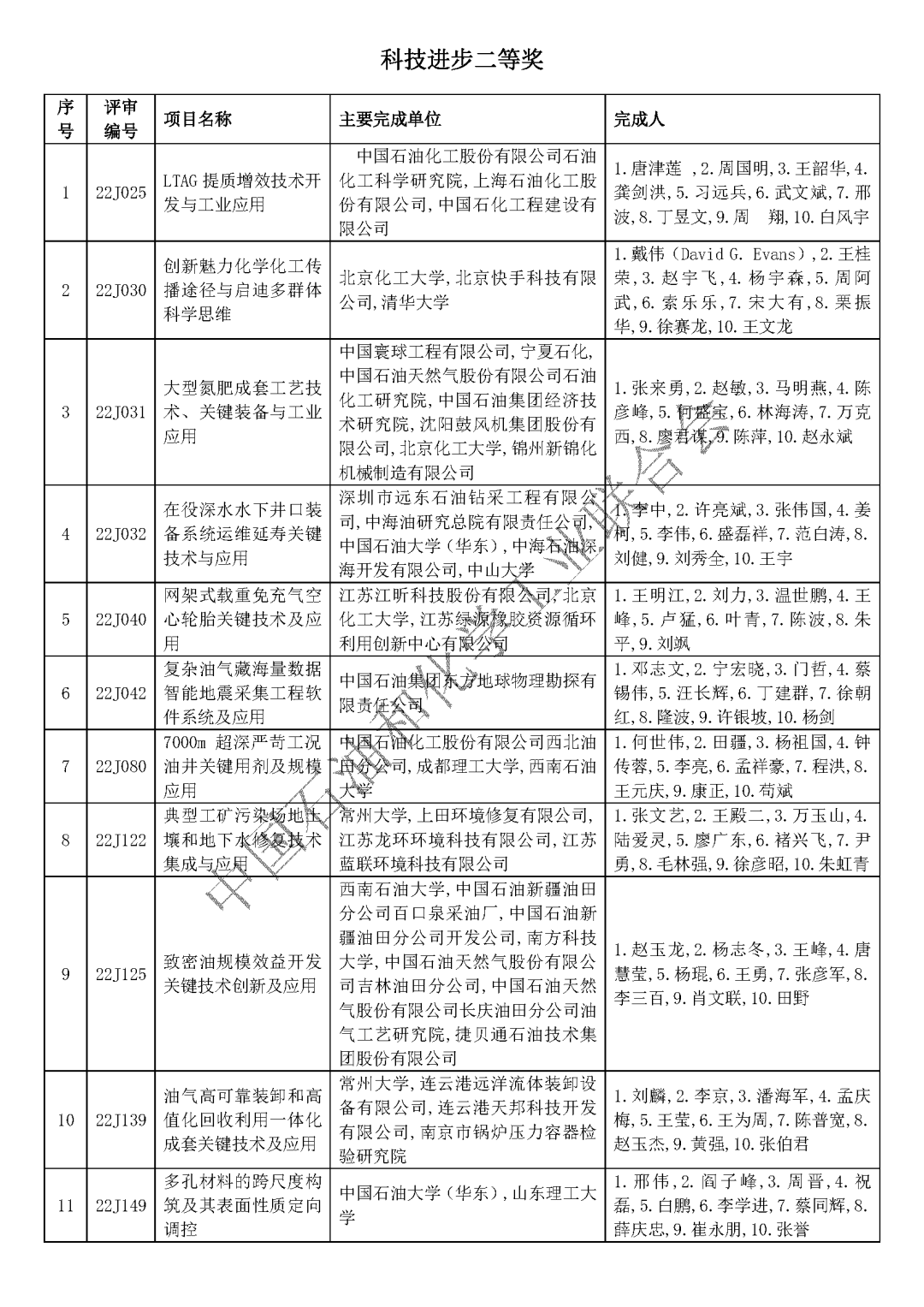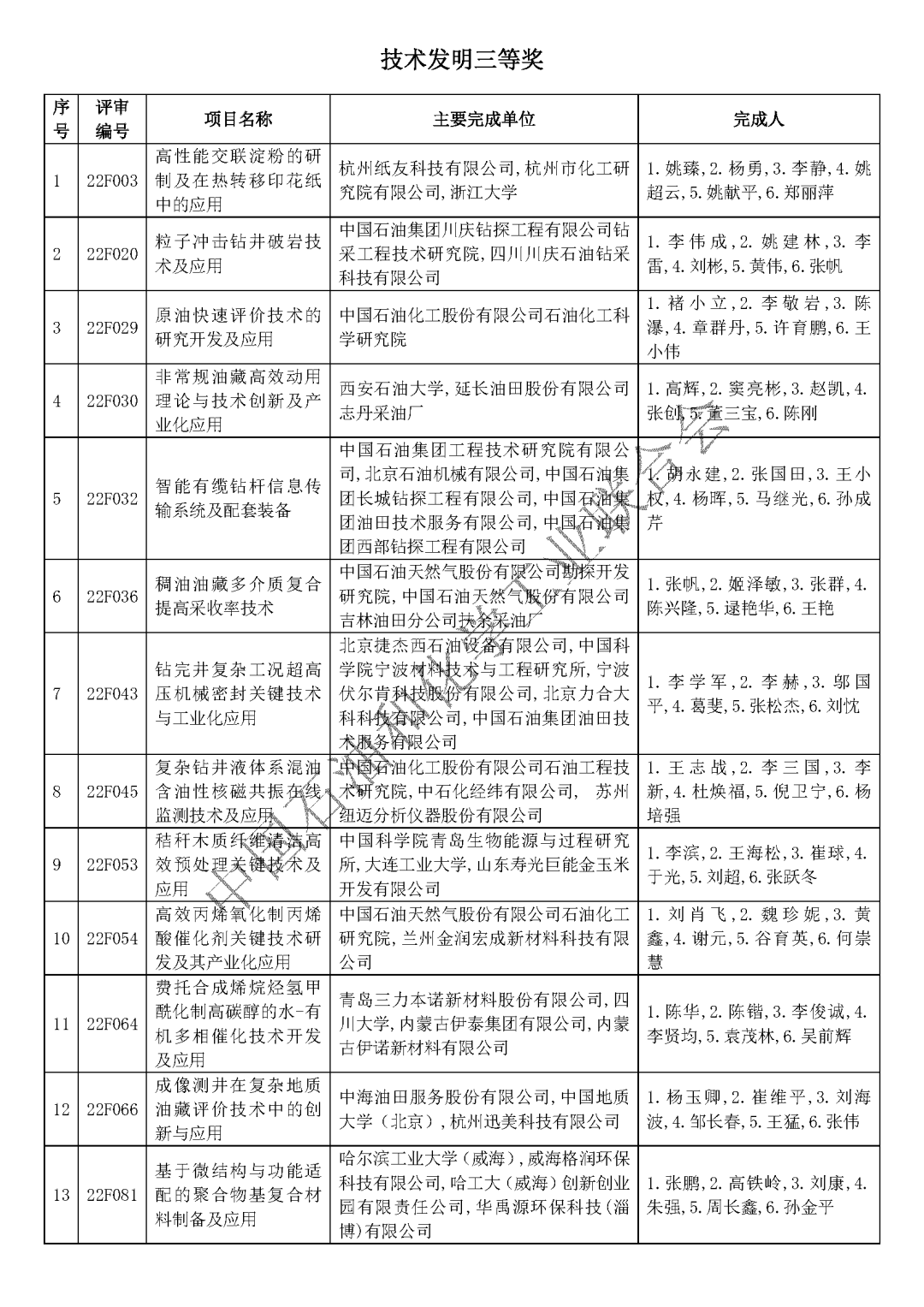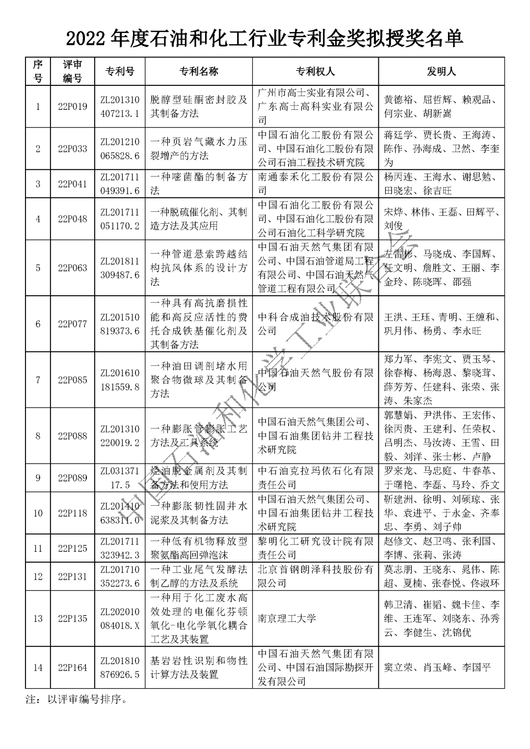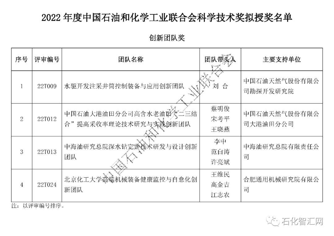 经我联合会组织有关专家评审,评出2022年度中国石油和化学工业联合会科学技术奖:技术发明奖44项(一等奖10项,二等奖11项,三等奖23项);科技进步奖240项(特等奖1项,一等奖38项,二等奖70项,三等奖131项);赵永镐科技创新奖2人;青年科学技术突出贡献奖13人;创新团队奖4个。石油和化工行业专利金奖14项,优秀奖72项。现将获奖项目名称、主要完成单位、主要完成人、专利权人、发明人等有关内容进行公示,向社会公告,以征求意见。自公告之日起,异议期为20天。如有异议,请在2022年12月10日前向联合会科技奖励工作办公室提出书面意见,并写明真实姓名、工作单位、联系地址和电话。