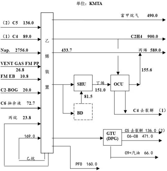 –包括C4一段加氢、脱异丁烯、OCU进料处理、烯烃 转化反应、脱乙烯和脱丙烯。