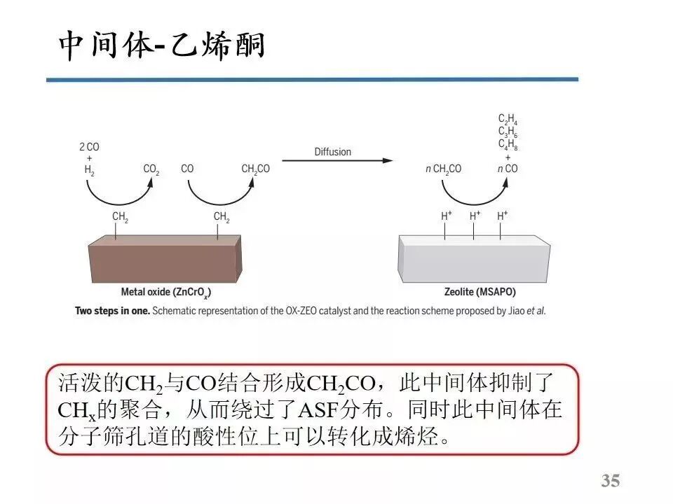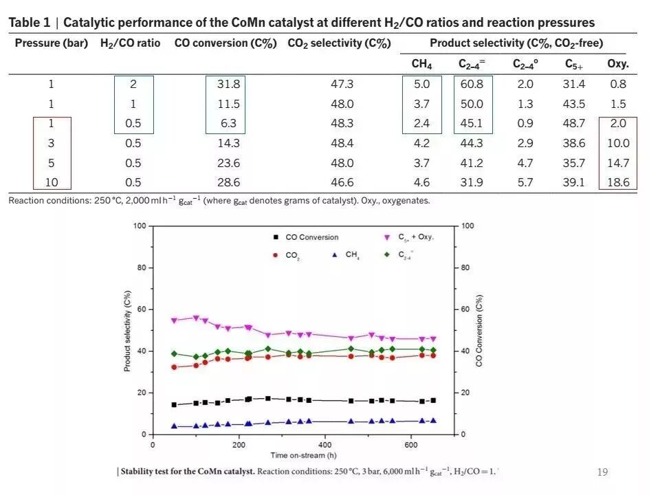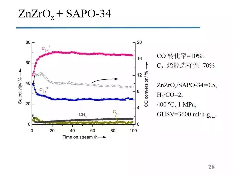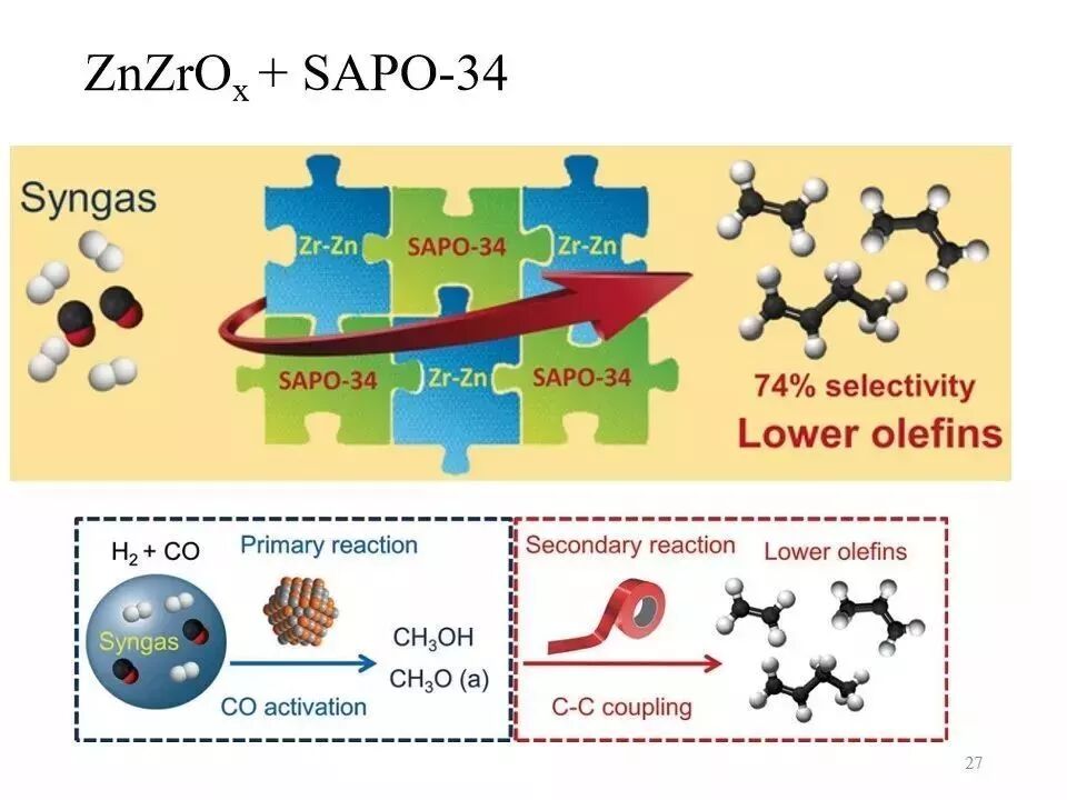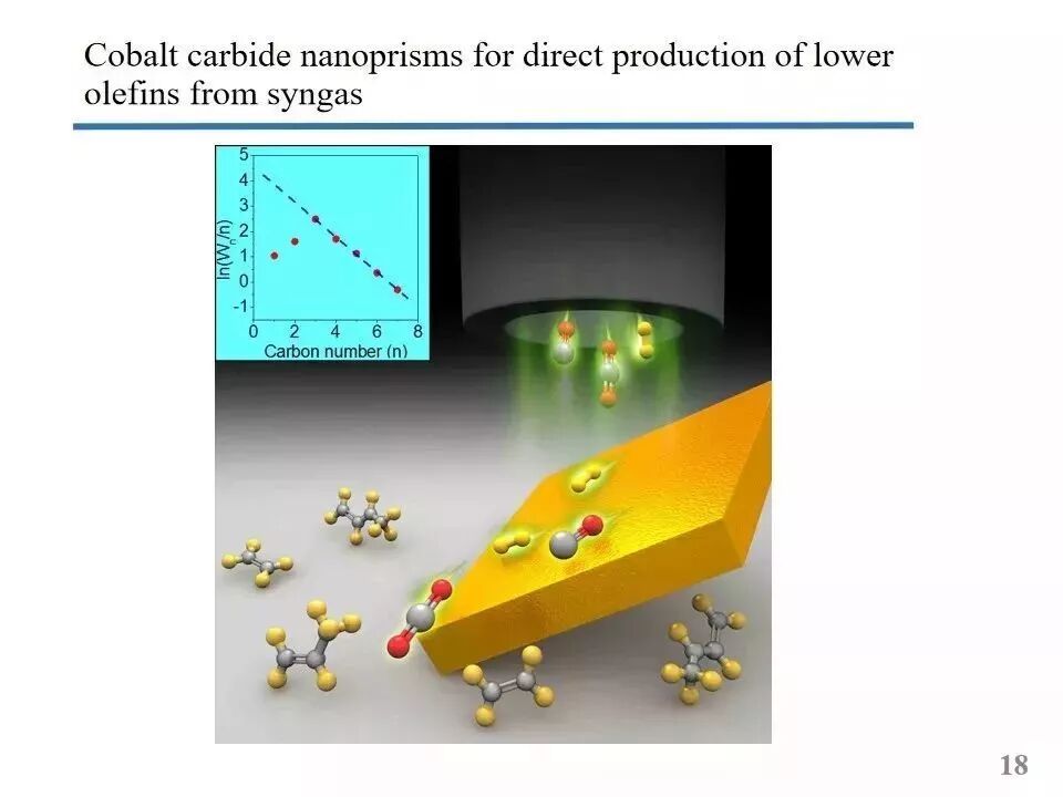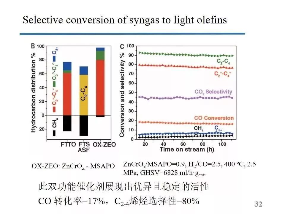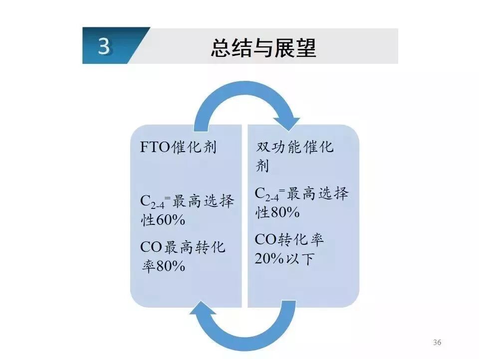 2016年3月消息,中科院大连化物所包信和院士研究团队创制了一种新型双功能的复合催化剂,实现了合成气直接转化,高选择性地制取低碳烯烃,当一氧化碳转化率17%时,乙烯、丙烯和丁烯等低碳烯烃的选择性大于80%。该过程摒弃了高耗能和高耗水的水煤气变换反应,从原理上开创了一条低耗水进行煤转化的新途径。