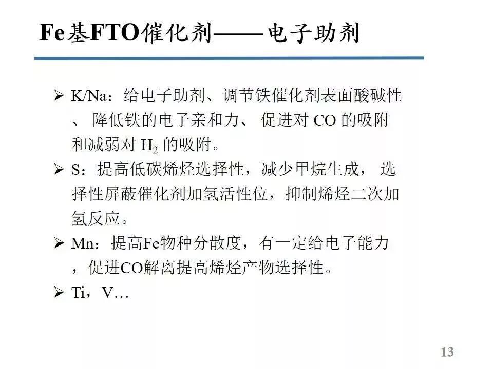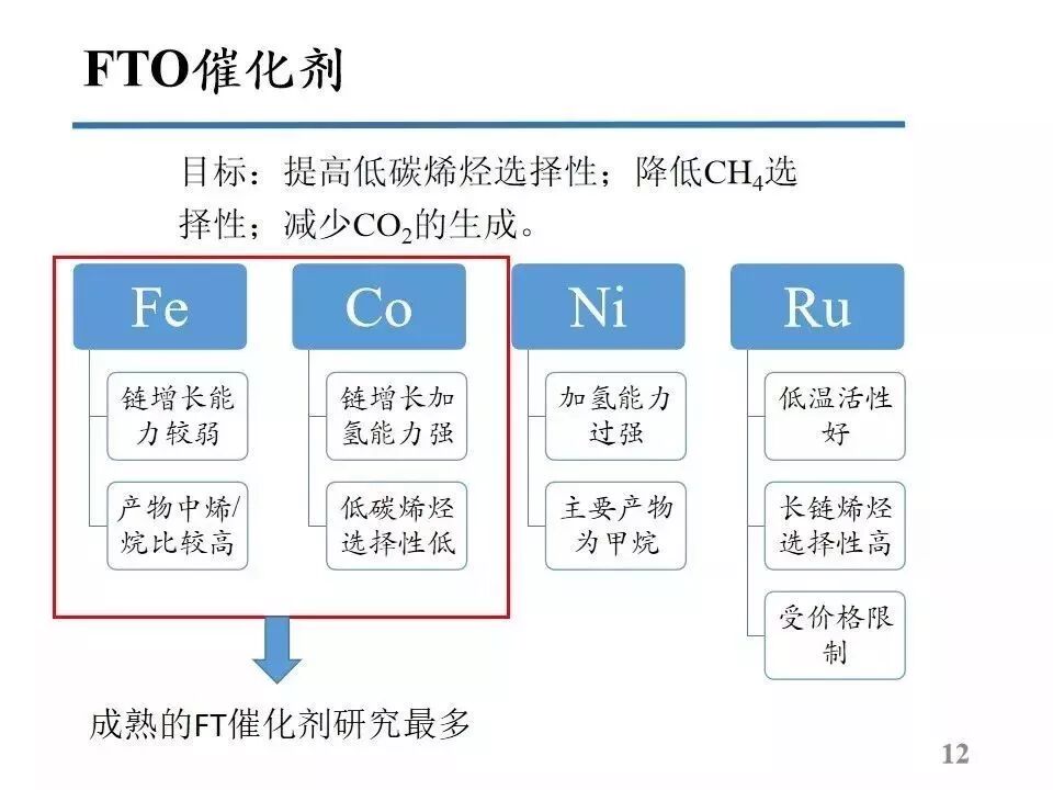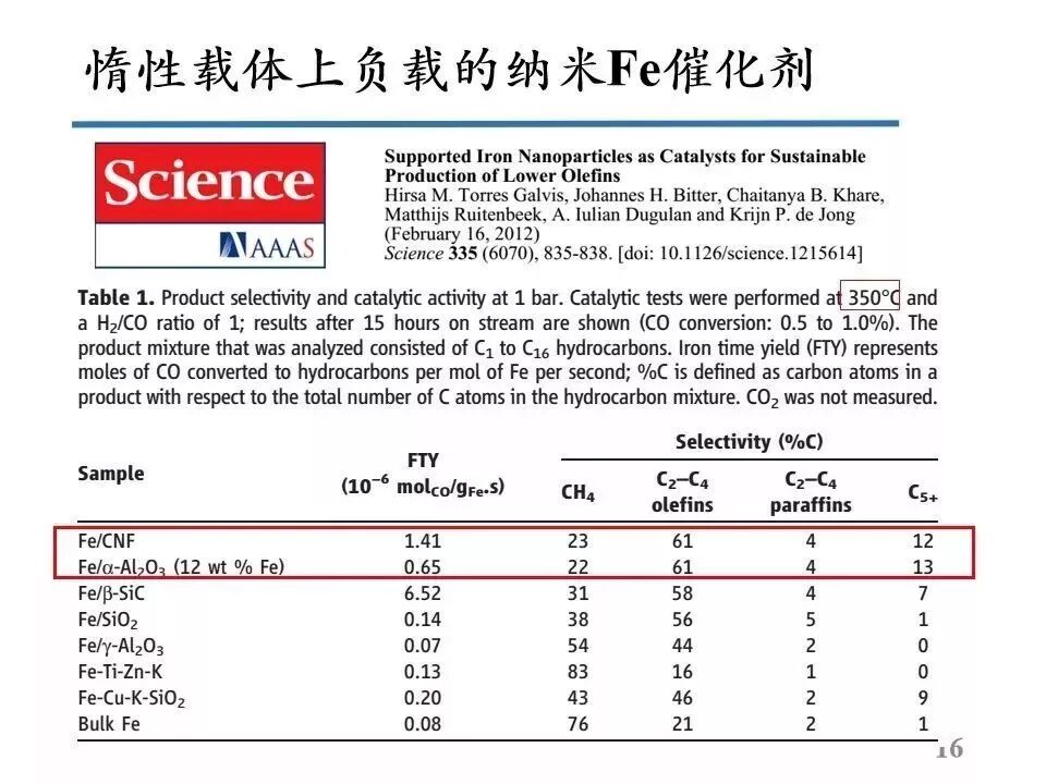 2016年10月消息,中科院上海高研院和上海科技大学联合科研团队通过采用全新催化剂活性位结构,实现了在温和条件下(250℃和1-5个标准大气压),合成气高选择性经费托合成直接制备烯烃,甲烷选择性可低至5%,低碳烯烃选择性可达60%,总烯烃选择性高达80%以上。