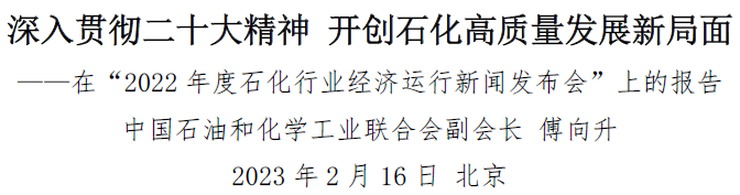2月16日,2022年度石化行业经济运行新闻发布会在京举行。中国石油和化学工业联合会副会长傅向升在会上作题为“深入贯彻二十大精神 开创石化高质量发展新局面”的主题报告。报告对过去一年石化行业经济运行的特点,当前石化行业经济运行面临的形势和机遇,以及新一年石化行业稳中求进的工作重点进行了详细分析。现全文刊登如下。