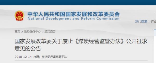国家发展改革委关于废止《煤炭经营监管办法》公开征求意见的公告